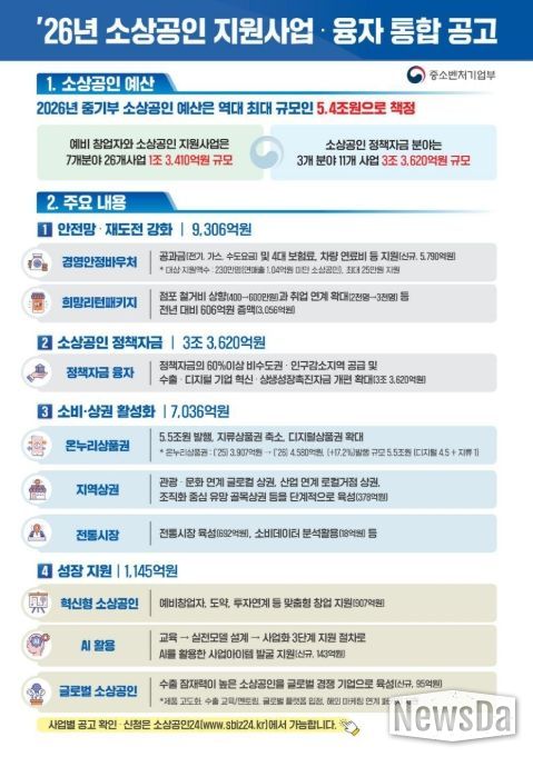 뉴스다 최광묵 기자 | 중소벤처기업부는 29일 2026년 소상공인 지원사업·융자 통합 공고를 조기에 시행하여 소상공인의 경영회복과 지속 성장을 뒷받침하기 위해 총 7개 분야의 다양한 정책 사업을 추진한다고 밝혔다.