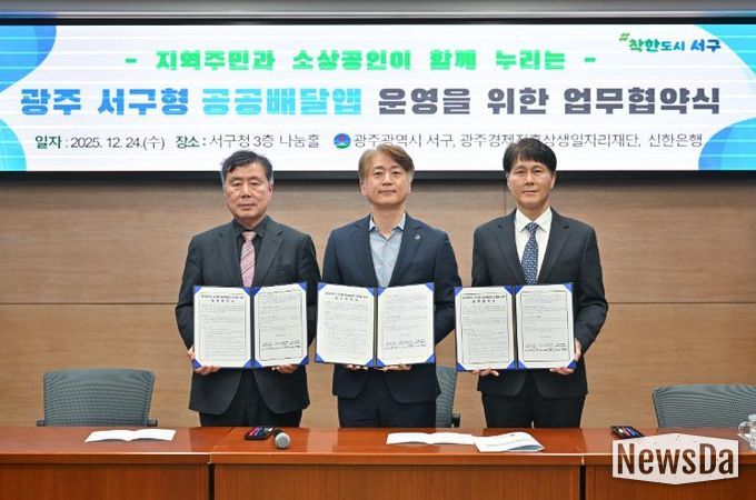 서구는 광주경제진흥상생일자리재단, ㈜신한은행 땡겨요 사업단과 ‘서구형 공공배달앱 운영을 위한 업무협약’을 체결하고, 온라인 배달 소비 영역까지 골목경제 회복 정책을 확대한다고 밝혔다.