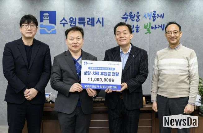 뉴스다 최광묵 기자 | 수원시 창업지원센터 입주기업협의회가 “학대 피해아동 지원에 사용해 달라”며 수원시에 후원금 1100만 원을 전달했다. 전달식은 30일 이재준 수원시장 집무실에서 열렸다.