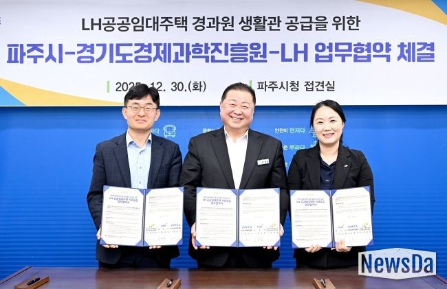 뉴스다 최광묵 기자 | 파주시는 30일 경기도경제과학진흥원, 한국토지주택공사 경기북부지역본부와 경과원 파주시 이전에 따른 엘에이치(LH) 공공임대주택 생활관 지원을 위한 업무협약을 체결했다고 밝혔다.