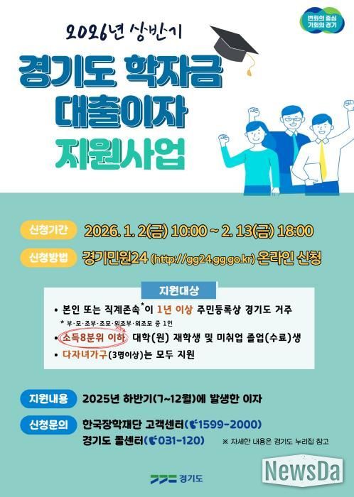 뉴스다 최광묵 기자 | 경기도가 오는 2월 13일까지 ‘2026년 상반기 경기도 대학생 학자금 대출이자 지원사업’ 신청자를 접수한다.