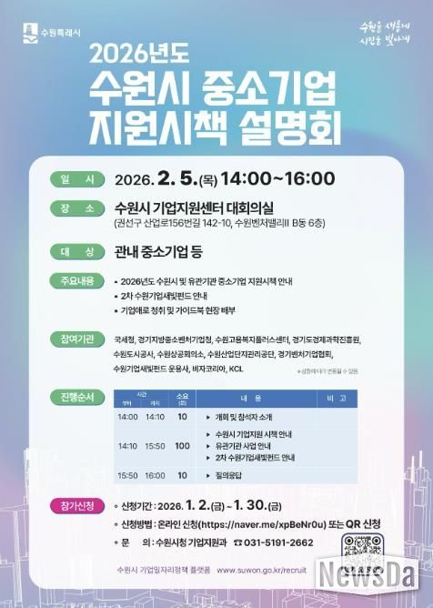 뉴스다 최광묵 기자 | 수원특례시가 ‘2026 중소기업 지원시책 설명회’에 참가할 수원시 중소기업 대표·임직원 100여 명을 1월 30일까지 모집한다.