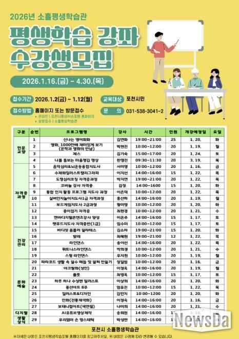 뉴스다 최광묵 기자 | 포천시는 오는 12일까지 소흘평생학습관에서 운영하는 2026년 1기 정규 평생학습 프로그램 수강생을 모집한다.