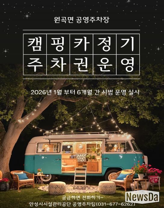뉴스다 최광묵 기자 | 안성시시설관리공단은 캠핑 인구 증가에 따른 주차 수요에 대응하고 캠핑카 이용객의 주차 불편을 해소하기 위해 오는 1월부터 원곡면 공영 주차장에서 ‘캠핑카(카라반 포함) 정기주차권’ 시범 운영을 실시한다고 밝혔다.