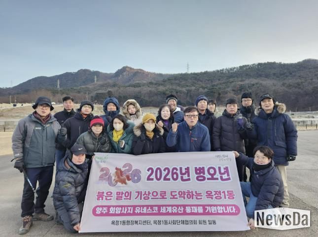뉴스다 최광묵 기자 | 양주시 옥정1동이 2026년 병오년 새해를 맞아 양주회암사지 유네스코 등재를 기원하며 회암사지 일원에서 ‘2026년 옥정1동 해맞이 행사’를 개최했다.