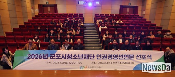 뉴스다 최광묵 기자 | 군포시청소년재단은 2026년 1월 2일, 군포시청소년수련관 4층 청소년어울림 극장에서 전 직원 대상 인권경영 선언문 선포식을 개최했다. 이번 행사는 재단 임직원 모두가 참여하여, 새해를 맞아 조직 내 인권경영 실천 의지를 공유하고 상호 존중과 인권 존중의 문화를 강화하기 위해 마련됐다.