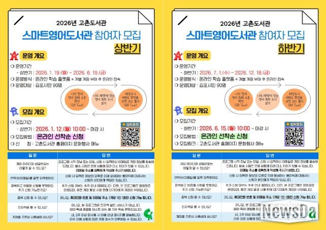 뉴스다 최광묵 기자 | 김포시 고촌도서관이 2026년 1월 19일부터 12월 18일까지 ‘2026년 스마트영어도서관’을 운영한다.