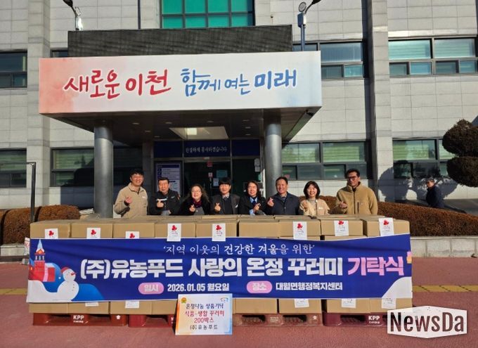뉴스다 최광묵 기자 | 이천시 대월면 소재 ㈜유농푸드는 5일 병오년(丙午年) 새해를 맞아 관내 취약가정의 건강한 겨울나기를 지원하기 위해 ‘사랑의 온정 꾸러미’ 200박스(1,400만 원 상당)를 대월면행정복지센터에 기탁했다.