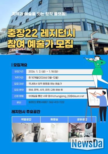 모집 기간은 오는 18일까지이며, 지원 자격은 국내에서 활동 중인 예술가로, 영상·문학·시각·공연·다원 예술 등 분야에 제한을 두지 않는다. 세부 일정과 신청 방법은 충장22 누리집에서 확인할 수 있다.