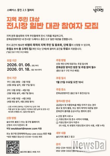 대관 유형은 일반 대관(전시형)으로 2026년 2월 28일부터 4월 26일까지 문화공장 방어진 내 전시장 ‘스페이스 중진2.5’에서 진행된다. 전시 공간이 필요한 지역 주민 및 동호회는 비영리 목적으로 참여할 수 있으며, 신청자가 3개 팀을 초과할 경우, 울산 동구 주민을 우선 선정 후, 잔여 팀에 대해 추첨을 통해 갤러리 공간을 지원한다.
