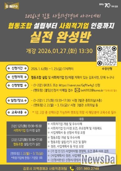 뉴스다 최광묵 기자 | 김포시가 사회문제 해결을 위한 참신한 아이디어와 실행력을 갖춘 사회적경제기업 육성을 위해 '2026년 김포시 사회적경제 아카데미'를 개설하고, 오는 1월 23일까지 수강생을 모집한다.