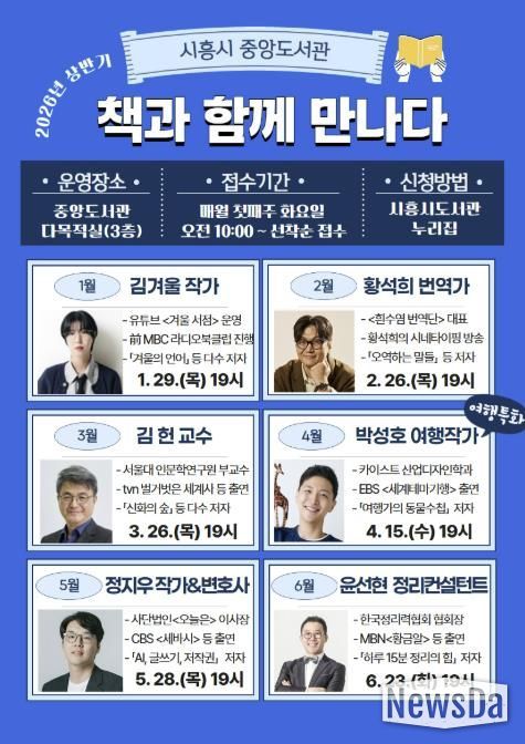 뉴스다 최광묵 기자 | 시흥시중앙도서관은 2026년 상반기 시민의 독서문화 향유 기회 확대와 인문적 소양 강화를 위해 운영하는 저자강연 ‘책과 함께 만나다’ 강연 출연진을 공개했다.