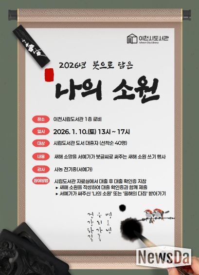 뉴스다 최광묵 기자 | 이천시립도서관은 2026년 병오년 새해를 맞아 시민의 한 해 소망과 다짐을 서예가가 붓글씨로 써주는 '2026년 붓으로 담은 ‘나의 소원’' 행사를 오는 1월 10일 오후 1시부터 5시까지 시립도서관 1층 책마당 로비에서 운영한다.