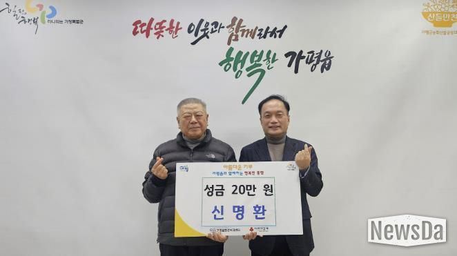 뉴스다 최광묵 기자 | 가평군 가평읍은 최근 가평읍 지역사회보장협의체 위원으로 활동하는 신명환 위원이 행정복지센터를 방문해 취약계층 이웃돕기 성금 20만 원을 기탁했다고 밝혔다.