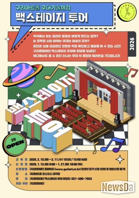 뉴스다 최광묵 기자 | 구리문화재단은 〈무대 기술 체험 백스테이지 투어 프로그램〉 참가자를 오는 1월 13일 오전 9시부터 1월 27일 오후 6시까지 재단 홈페이지를 통해 선착순 모집한다고 밝혔다.