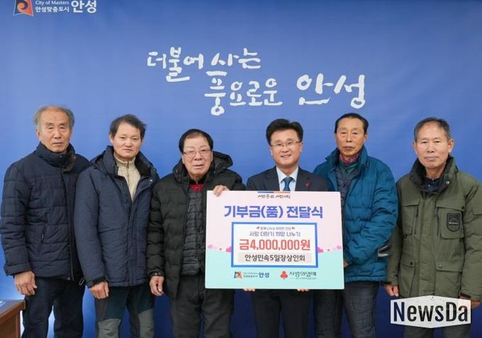 뉴스다 최광묵 기자 | 안성시는 1월 8일 민속오일장 상인회로부터 400만 원의 성금을 전달받았다고 밝혔다. 전달식에는 상인회 임원진과 시 관계자가 참석한 가운데 진행됐다.