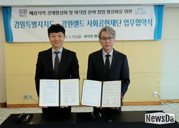 뉴스다 최광묵 기자 | 강원특별자치도와 강원랜드 사회공헌재단은 1월 9일 오전 11시, 강원랜드 하이원팰리스호텔에서 폐광지역 경제활성화 및 외식업 분야 창업기업의 경쟁력 강화를 위해 업무협약(MOU)을 체결했다고 밝혔다.