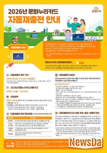 뉴스다 최광묵 기자 | 김포시는 오는 1월 16일부터 21일까지 4영업일 간 2026년 문화누리카드 자동재충전을 실시한다고 밝혔다.