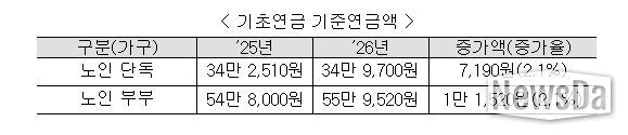한편, 기초연금 기준연금액 역시 기초연금법에 따라 전년도 소비자물가상승률 2.1%를 반영하여, 2025년 34만 2,510원에서 2026년 34만 9,700원으로 늘어난다. 올해 기초연금을 받는 약 779만 명의 어르신들은 1월부터 인상된 기초연금액을 지급받게 되며, 기초연금 기준연금액의 인상을 위해 관련 고시를 1월 중 개정할 계획이다.