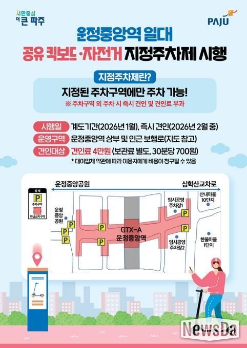 뉴스다 최광묵 기자 | 파주시는 운정중앙역 일대의 보행자 안전을 확보하고 공유 이동장치의 무분별한 방치를 해소하기 위해 운정중앙역 상부와 인근 보행로를 대상으로 공유 이동장치 ‘지정주차제’를 시행한다고 12일 밝혔다.