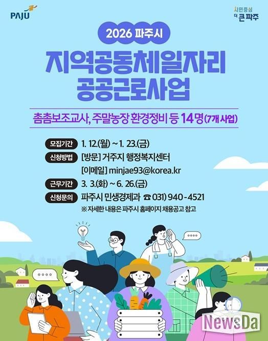 뉴스다 최광묵 기자 | 파주시가 오는 23일까지 2026년 상반기 지역공동체 일자리 및 공공근로사업 참여자 14명을 모집한다고 밝혔다.