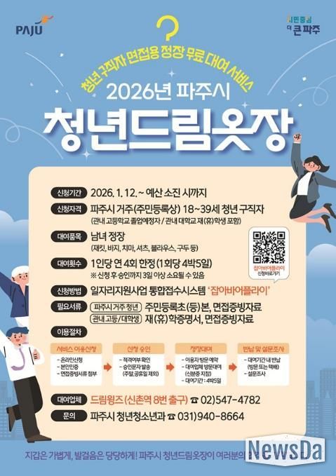 뉴스다 최광묵 기자 | 파주시는 관내 청년 구직자에게 면접용 정장을 무료로 대여해 주는 녪년 청년드림옷장’사업을 12일부터 재개한다고 밝혔다.