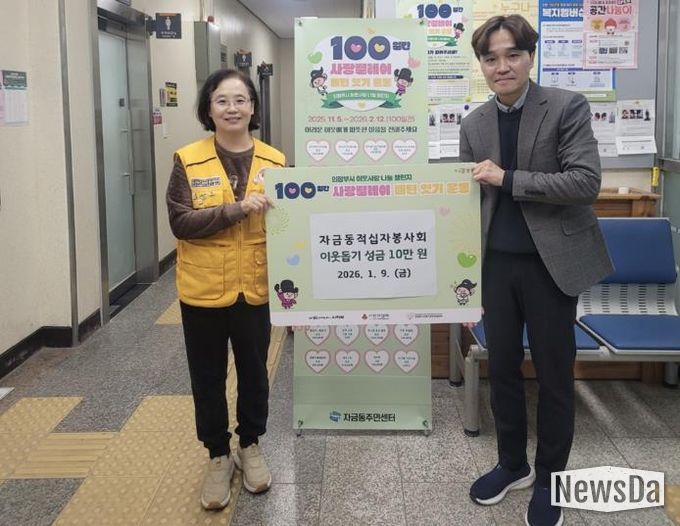 뉴스다 최광묵 기자 | 의정부시 자금동주민센터는 1월 9일 대한적십자사 자금동 적십자봉사회가 ‘100일간 사랑릴레이 배턴 잇기’에 동참해 성금 10만 원을 기탁했다고 밝혔다.