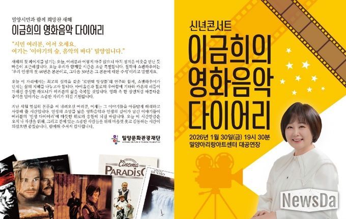 뉴스다 최광묵 기자 | 밀양문화관광재단은 오는 30일 밀양아리랑아트센터 대공연장에서 새해를 맞아 시민들에게 희망의 메시지를 전하는 신년 콘서트 ‘이금희의 영화음악 다이어리’를 개최한다.
