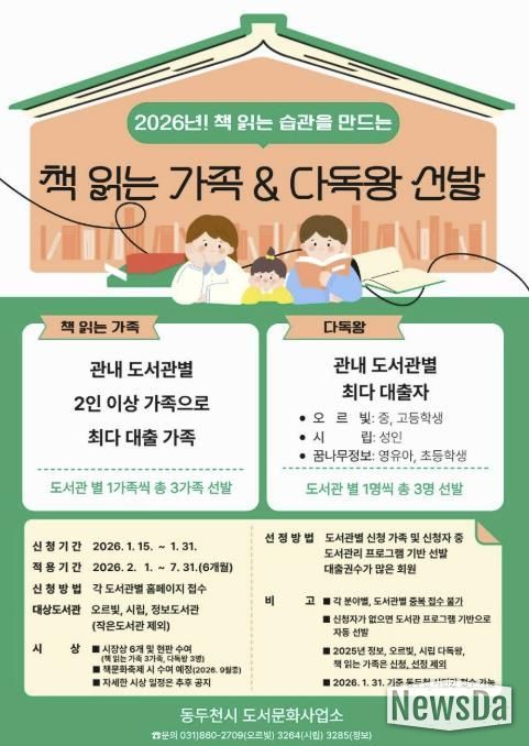 뉴스다 최광묵 기자 | 동두천시 도서문화사업소는 오는 1월 15일부터 31일까지 관내 시민을 대상으로 ‘책 읽는 가족’과 ‘다독왕’ 선발을 위한 참여자 신청을 받는다.