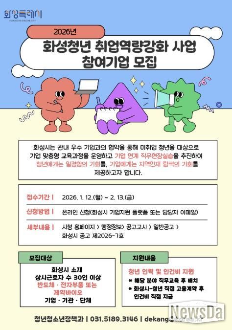 뉴스다 최광묵 기자 | 화성특례시가 12일부터 다음 달 13일까지 청년 구직자의 실질적인 직무역량 강화와 지역 전략산업 맞춤형 인재 양성을 위한 ‘2026년 화성청년 취업역량강화 사업’ 참여기업을 모집한다.