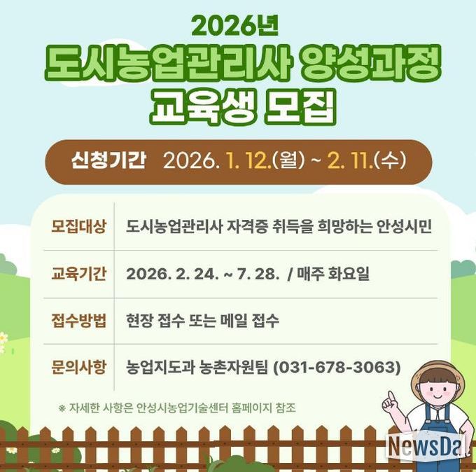 뉴스다 최광묵 기자 | 안성시농업기술센터는 1월 12일부터 2월 11일까지 도시농업 전문인력 양성을 위한 ‘제7기 도시농업관리사 양성과정’ 교육생을 모집한다.