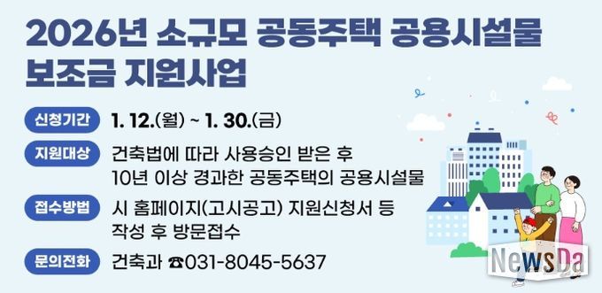 뉴스다 최광묵 기자 | 안양시가 안전하고 쾌적한 주거환경 조성을 위해 ‘2026년 소규모 공동주택 공용시설물 보조금 지원사업’을 추진한다고 12일 밝혔다.