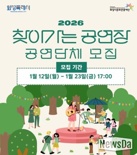 뉴스다 최광묵 기자 | (재)화성시문화관광재단은 1월 12일부터 1월 23일까지 ‘2026 찾아가는공연장’ 참여 공연단체를 모집한다고 밝혔다.