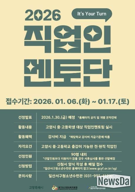 뉴스다 최광묵 기자 | 고양시청소년재단 일산서구청소년수련관이 청소년들의 진로 탐색·설계를 지원하기 위한 ‘2026 직업인멘토단’을 모집한다고 밝혔다.