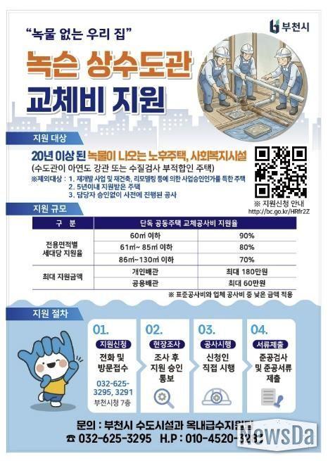 신청 기간은 올해 11월 말까지이며, 예산 소진 시 조기 마감될 수 있다. 지원을 원하는 시민은 부천시 수도자원국 수도시설과(032-625-3295, 3291)로 전화하거나 방문해 접수하면 된다. 자세한 사항은 부천시 홈페이지 ‘새소식’ 게시판에서 확인할 수 있으며, 안내 포스터의 큐알(QR)코드를 통해서도 접속 가능하다.