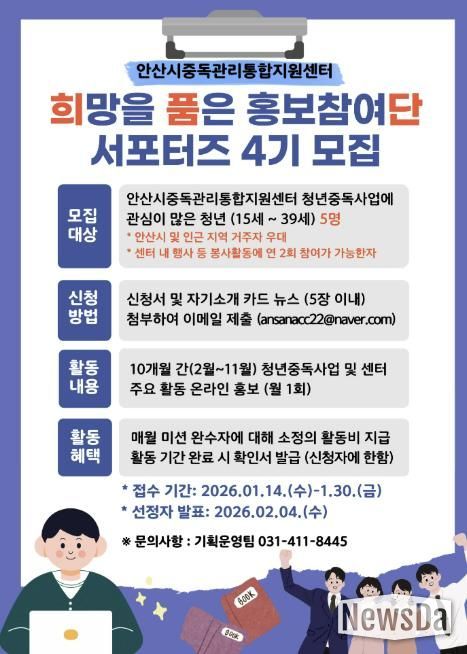 이번 서포터즈는 안산시중독관리통합지원센터의 중독 관련 사업과 청년 중독 문제에 관심 있는 만 15세부터 39세까지의 청년을 대상으로 하며, 안산시 및 인근 지역 거주자를 우대 총 5명을 모집한다.