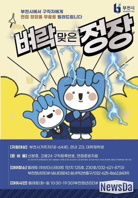 뉴스다 최광묵 기자 | 부천시는 취업을 준비하는 시민의 경제적 부담을 덜기 위해 ‘벼락 맞은 정장’ 면접정장 무료 대여사업을 지난해에 이어 올해도 지속 운영한다고 13일 밝혔다.
