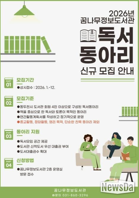 뉴스다 최광묵 기자 | 동두천시 도서문화사업소 꿈나무정보도서관은 시민들의 인문적 사고력 향상과 토론 문화 활성화를 위해 2026년 신규 독서동아리를 모집한다고 밝혔다.