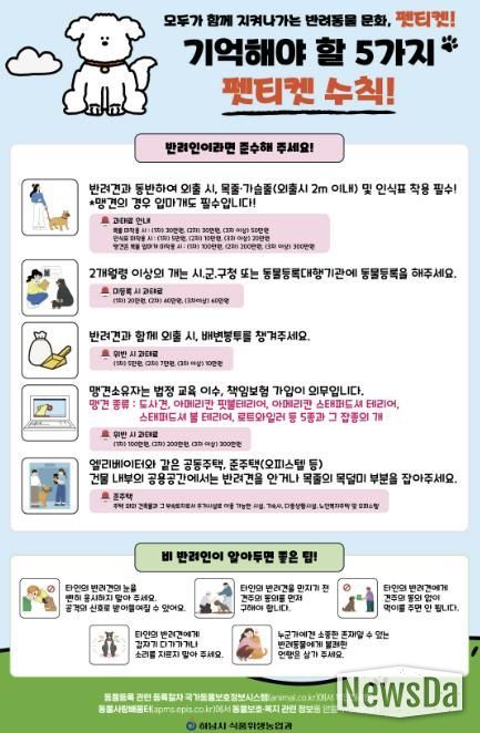 홍보물에는 ▲외출 시 목줄·가슴줄(2m 이내) 및 인식표 착용 ▲2개월령 이상 반려견의 동물등록 ▲배변 봉투 지참 ▲맹견 소유자의 법정 교육 이수 ▲엘리베이터 내 반려동물 안기 등 '기억해야 할 5가지 펫티켓'이 담겼다. 비반려인을 위해서도 타인의 반려견을 응시하거나 동의 없이 만지지 않기 등의 에티켓을 함께 안내해 주민 간 갈등 예방에 힘쓰고 있다.