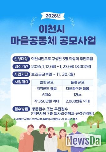 뉴스다 최광묵 기자 | 이천시는 주민이 직접 제안하고 실행하는 공동체 활동을 지원하기 위해 ‘2026년 이천시 마을공동체 공모사업’ 참여 공동체를 모집한다고 밝혔다.