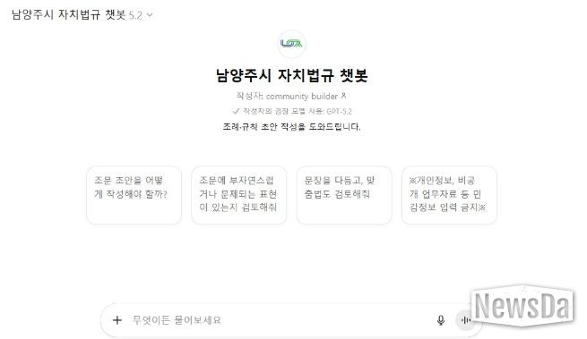 뉴스다 최광묵 기자 | 남양주시는 이달부터 전 직원을 대상으로 자치법규 업무를 지원하는 생성형 인공지능(AI) 기반 ‘남양주시 자치법규 챗봇’ 운영을 시작했다고 14일 밝혔다.