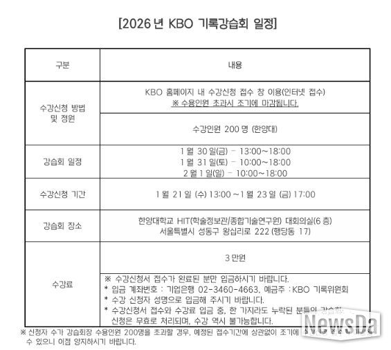 뉴스다 류대현 기자 | 2026년 KBO 기록강습회가 1월 30일(금)부터 2월 1일(일)까지 서울 한양대학교에서 개최된다. 기록강습회는 야구 공식기록법의 보급과 이해를 통한 저변 확대를 목적으로 프로야구 원년인 1982년부터 개최됐다.