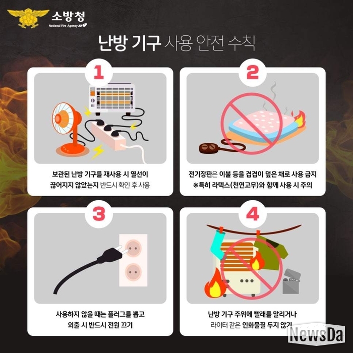 소방서는 난방기기 화재 예방을 위해 다음과 같은 안전수칙을 당부했다. ▲ KC 인증을 받은 난방기기 사용하기 ▲ 전기히터 주변 1m 이내 가연물 두지 않기 ▲ 전기장판·전기매트 접거나 겹쳐 사용하지 않기 ▲ 장시간 사용 자제 및 외출 시 전원 차단하기 ▲ 전선 훼손이나 과열 징후 발견 시 즉시 사용 중지하기 등 이다.