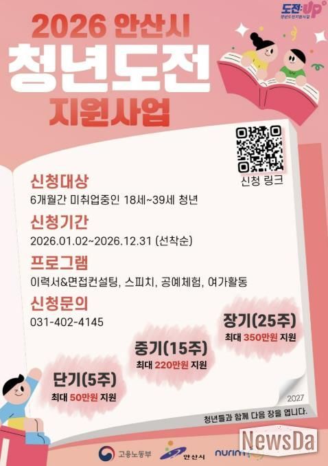 뉴스다 최광묵 기자 | 안산시가 구직 청년들의 사회 진입과 취업을 지원하기 위해 청년도전 지원 사업 참여자를 모집한다고 15일 밝혔다.