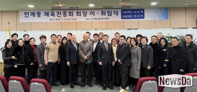뉴스다 최광묵 기자 | 수원시 팔달구 인계동 체육진흥회는 지난 14일, 인계동 행정복지센터에서 주요 내빈과 관계자 등 50여 명이 참석한 가운데 ‘인계동 체육진흥회장 이‧취임식’을 성황리에 개최했다.