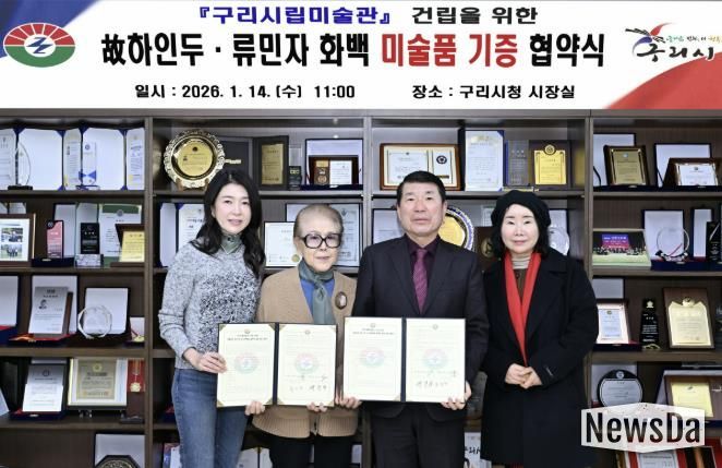 뉴스다 최광묵 기자 | 구리시는 지난 14일 시청 3층 시장실에서 ‘구리시립미술관 건립을 위한 작품 기증 협약식’을 개최했다. 이번 협약식은 한국 현대미술사의 거장 고(故) 하인두 화백의 작품 80점과 류민자 화백의 작품 25점을 기증받고, 문화예술 교류 협력을 공식화하기 위해 마련됐다.