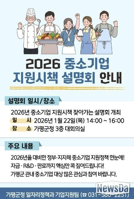 뉴스다 최광묵 기자 | 가평군이 관내 중소기업의 경영 안정과 경쟁력 강화를 위해 새해 정부의 지원시책을 한자리에 모아 안내하는 설명회를 연다.