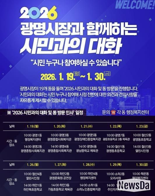 한편, 구체적인 방문 일정은 ▲19일 오전 10시 광명1동, 오후 2시 광명2동 ▲20일 오전 10시 광명3동, 오후 2시 광명4동 ▲21일 오전 10시 광명5동, 오후 2시 광명6동 ▲22일 오전 10시 광명7동, 오후 2시 철산1동 ▲23일 오전 10시 철산2동, 오후 2시 철산3동 ▲26일 오전 10시 철산4동, 오후2시 하안1동 ▲27일 오전 10시 하안2동, 오후 2시 하안3동 ▲28일 오전 10시 하안4동, 오후 2시 소하1동 ▲29일 오전 10시 소하2동, 오후 2시 일직동 ▲30일 오전 10시 학온동이다.