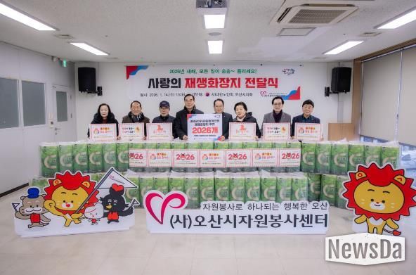 뉴스다 최광묵 기자 | (사)오산시자원봉사센터는 지난 14일, 2026년 새해를 맞아 (사)대한노인회 오산시지회에 재생화장지 2,026롤을 전달했다고 밝혔다.