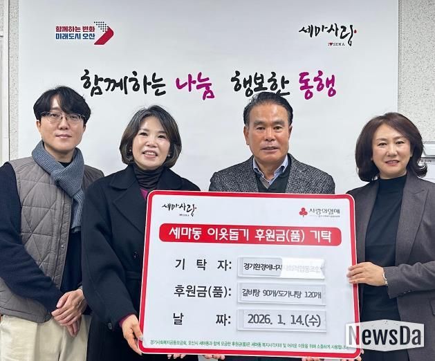 뉴스다 최광묵 기자 | 오산시 세마동 행정복지센터는 지난 14일 경기환경에너지사회적협동조합으로부터 관내 위기이웃 지원을 위한 갈비탕 90개와 도가니탕 120개 등 약 100만 원 상당의 후원 물품을 기탁받았다고 밝혔다.